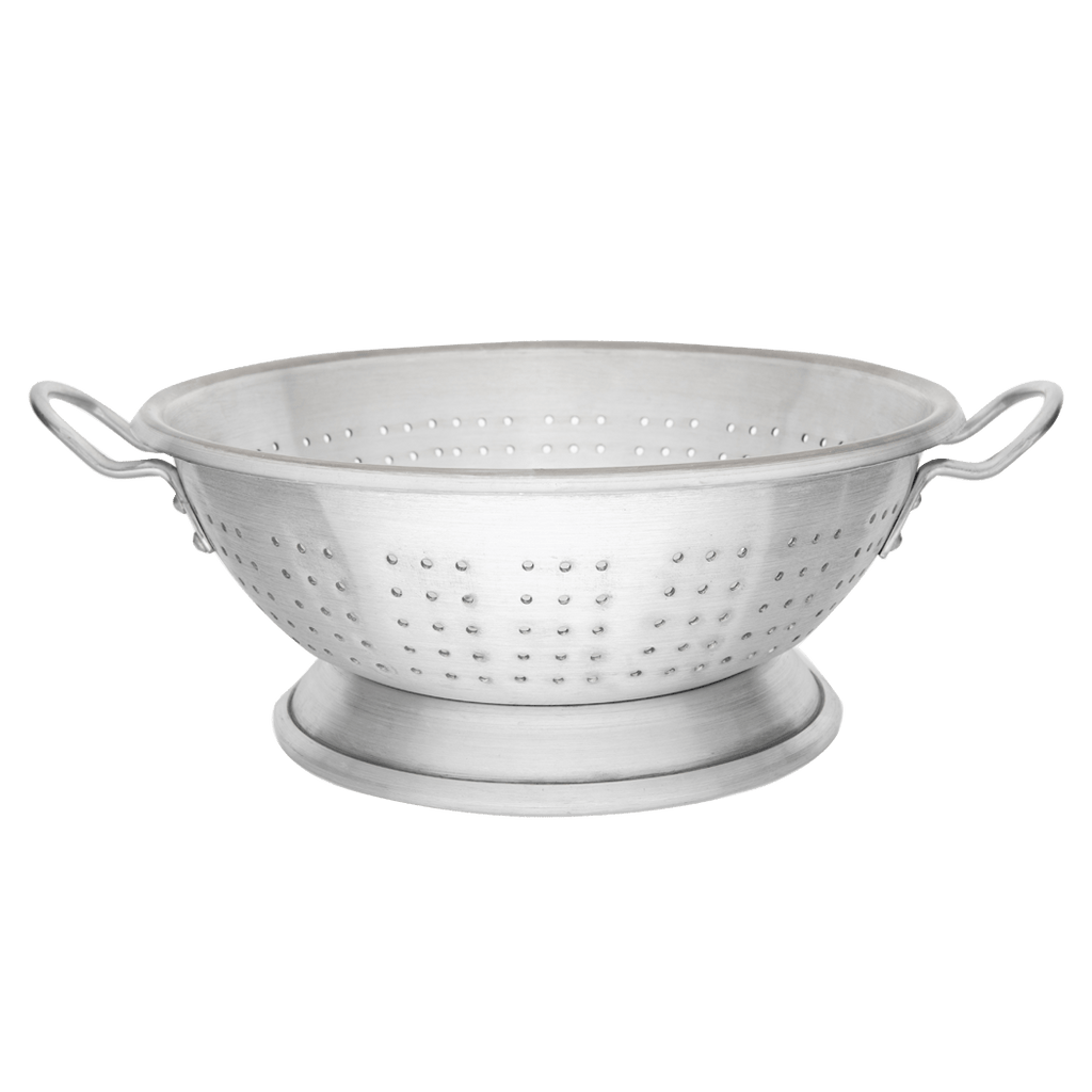 The Browne Foodservice 15qt/15L Heavy-Duty Aluminum Colander (5811616) is a durable and reliable kitchen essential designed for commercial and home use. With a 16” (41.9cm) diameter, it features sturdy handles and a stable base for easy handling and efficient draining. Made from heavy-duty aluminum, it resists corrosion and ensures long-lasting performance. Ideal for rinsing vegetables, draining pasta, and more.
