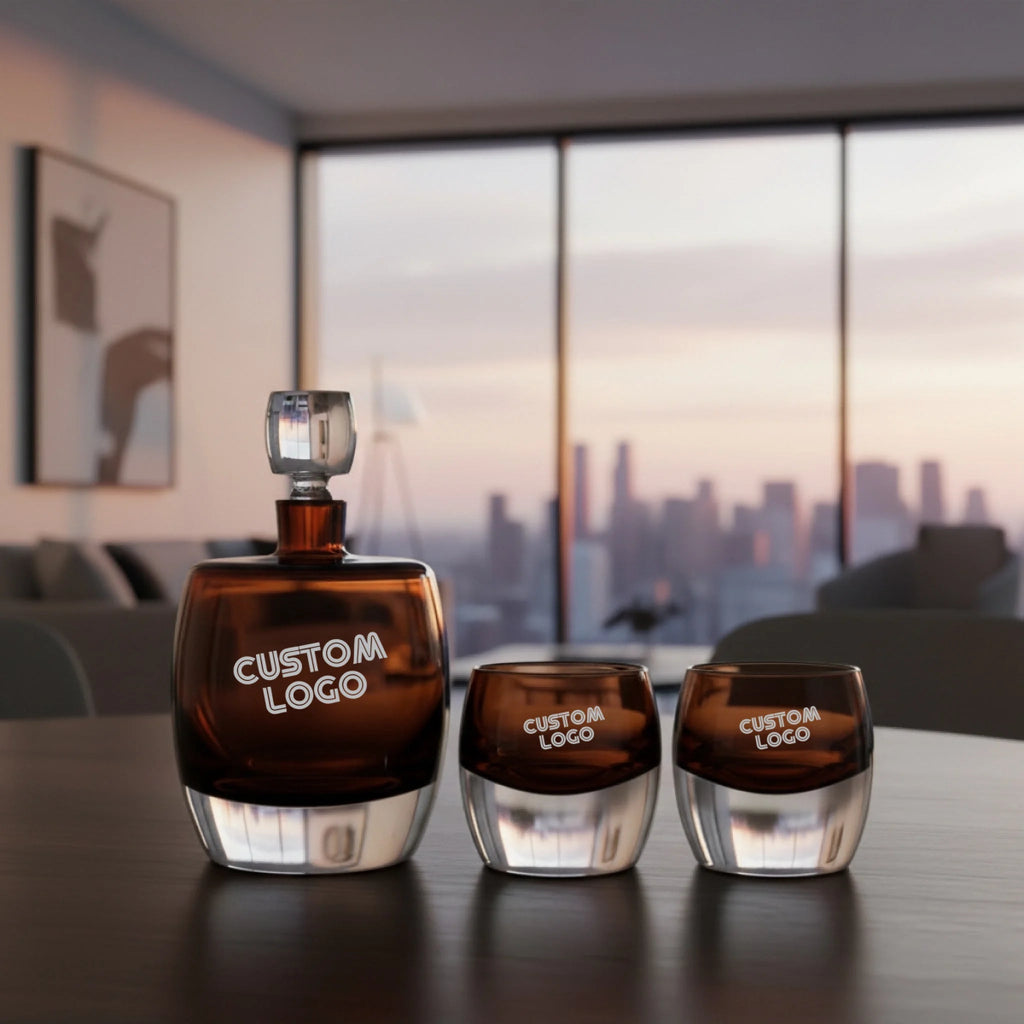 Elevate any bar collection with this striking modern whiskey decanter set, expertly handcrafted by master glassblowers. This premium set includes a 1.05L mouth-blown decanter and two weighty tumblers, each featuring a rich cased brown glass core encased within a flawless layer of clear crystal. Now available with precision laser engraving, this set becomes an unforgettable personalized gift for whiskey lovers, collectors, weddings, anniversaries, corporate gifting, and milestone celebrations.