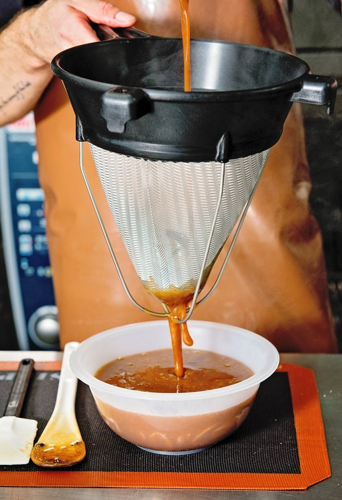 The Matfer Bourgeat Exoglass Bouillon Strainer/Chinois, 10", is a versatile kitchen tool designed for professional and home chefs alike. Crafted from durable Exoglass material, this 10-inch strainer efficiently strains soups, sauces, stocks, and more. Its fine mesh ensures smooth consistency while its sturdy construction promises long-lasting durability. Perfect for achieving culinary perfection with ease.