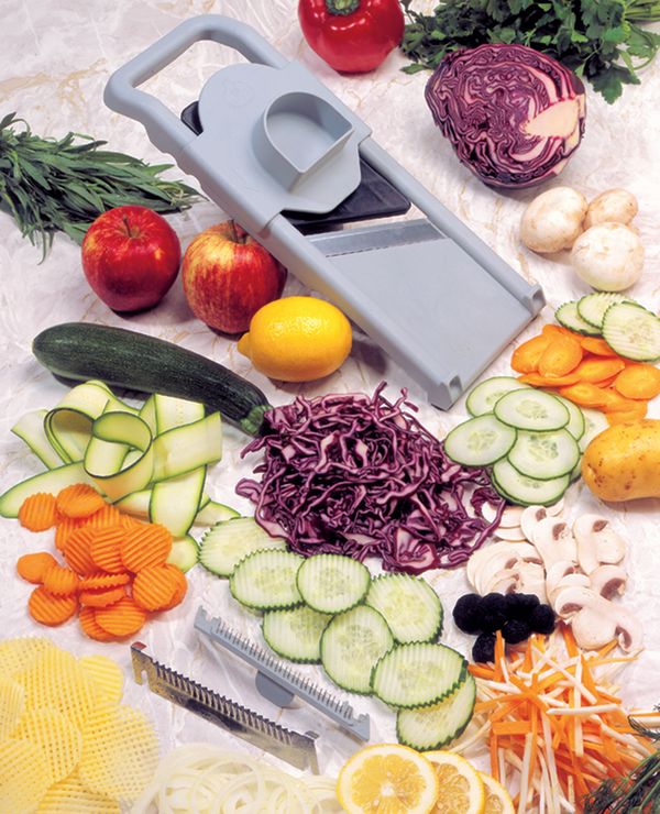DELIVERED WITH: Removable and interchangeable straight blade. Easy to fit julienne blade. Serrated blade. Pusher protector provides hand protection at all times. Suited for all shapes and sizes of vegetables.