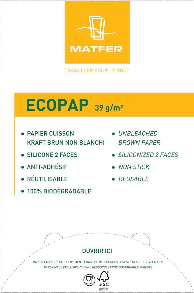 Matfer Bourgeat Ecopap Baking Paper offers superior quality and eco friendly performance for culinary professionals. With dimensions of 23 3/4" x 15 3/4" and a weight of 39 g/m2, this box contains 500 sheets, ideal for a variety of baking needs. It ensures non-stick baking, easy cleanup, and sustainability, making it a trusted choice in commercial kitchens worldwide.